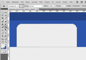 Die Auswahl wird jetzt noch weiter verändert. Dazu wählen wir im Menü Auswahl/Auswahl verändern/abrunden und geben dort einen Radius von 5 Pixel an. Die Auswahl soll aber nur oben abgerundet sein, deshalb korrigieren wir die unteren Ecken mit dem Auswahlrechteck-Werkzeug. Anschließend sollte die Auswahl so aussehen und mit dem Füllwerkzeug (#ededed) gefüllt werden.