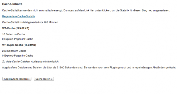 Über den Tab Inhalte kann Einsicht in alle Cache-Dateien genommen werden, zumindest bis zu einer gewissen Größe des Caches. Ist der Cache zu groß wird eine Statistik mit Informationen zur Menge der gespeicherten Cache-Dateien angezeigt. Um die jeweils aktuelle Statistik anzuzeigen, muss vorher der Link „Regeneriere Cache-Statistik“ angeklickt werden.